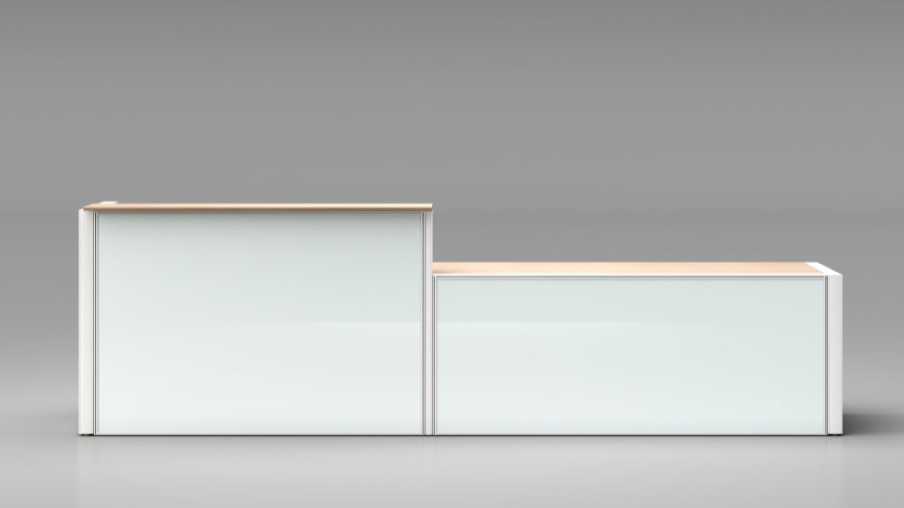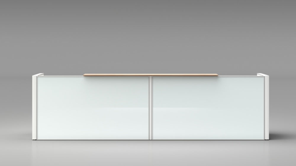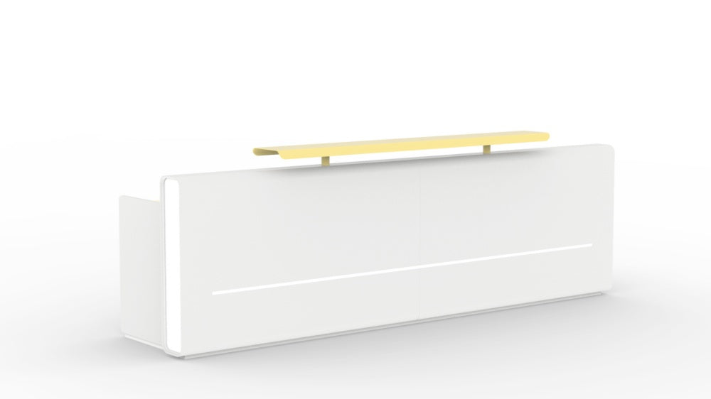 The 42-inch-high visitor shelf is also steel, laminated in over 30 RAL shades—from corporate navy to millennial blush—giving guests a firm, easy-clean surface for signing NDAs, filling forms or resting coffee cups. A 1/8-inch reveal lip prevents pens from rolling off and conceals discreet cable slots that feed down to the staff side for countertop tablets or POS systems.